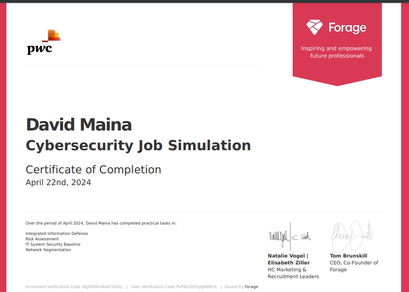 -Completed a job simulation involving cybersecurity for PwC Digital Intelligence, gaining experience in understanding and explaining the concept of integrated defense